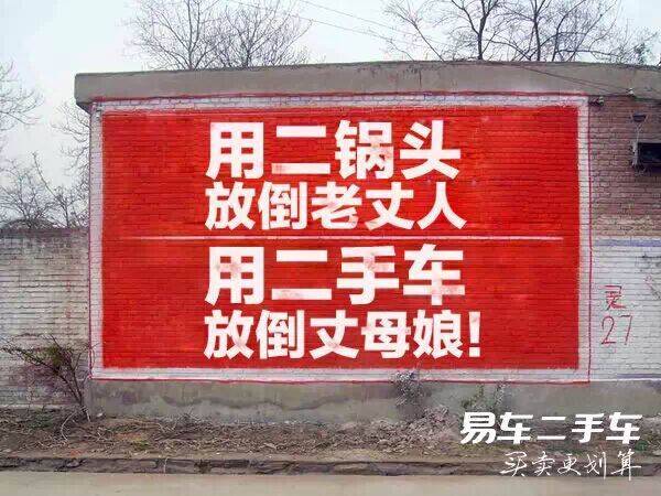 易车率先晒出墙体海报:“用二锅头放倒老丈人,用二手车放倒丈母娘!”画面感极强!
