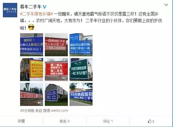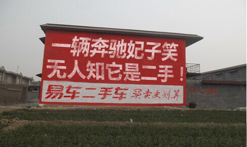 不要以为只有阿里、京东、苏宁盯上了8亿农民的钱包,更不要以为电商进村的只是衣服、家电、化肥。农村市场巨大的电商蓝海已经吸引了汽车这类大件商品进村,这几天,由易车带动的墙体海报风引发了一轮二手车电商行业的集体进村行动,五颜六色的海报刷出了风格、刷出了水平、刷出了友谊。